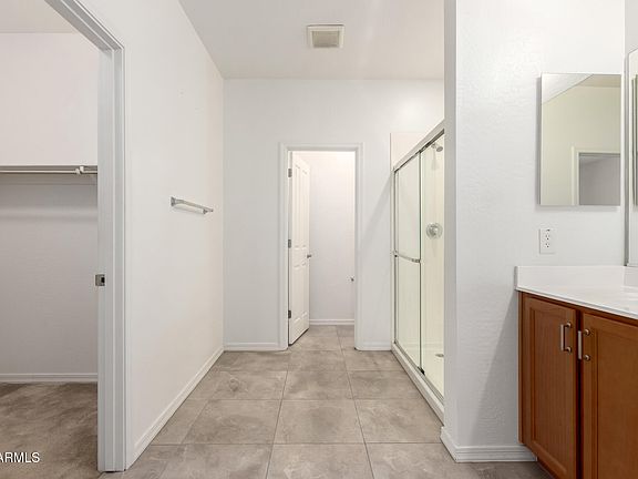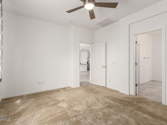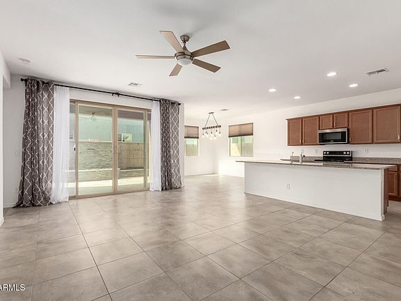 Become the proud owner of this delightful 3-bedroom, 2-bath home in Eastmark! Discover a serene open layout with high ceilings, a soothing palette, durable tile flooring, and sliding door access to the backyard for seamless indoor-outdoor living. The gourmet kitchen features granite counters, abundant wood cabinetry with crown moulding, recessed lighting, stainless steel appliances, a handy pantry, and an island with a breakfast bar for casual meals. The primary bedroom showcases soft carpeting, a private bathroom, and a practical walk-in closet. Outside, you'll find a covered patio, travertine pavers, a tranquil water feature, and pristine artificial turf. Don't miss out on this fantastic opportunity!