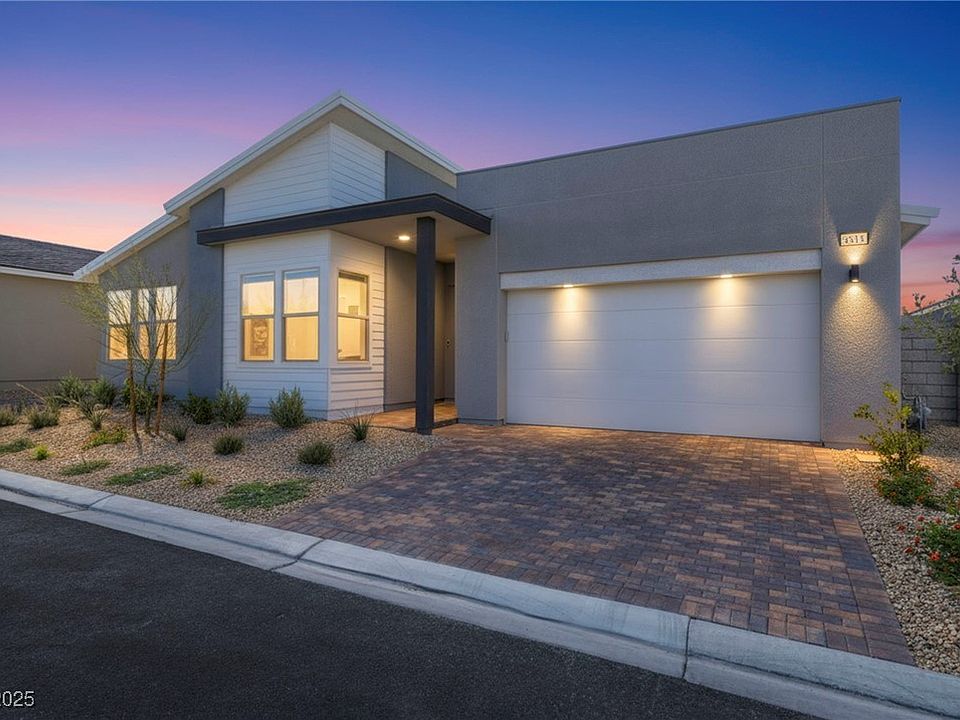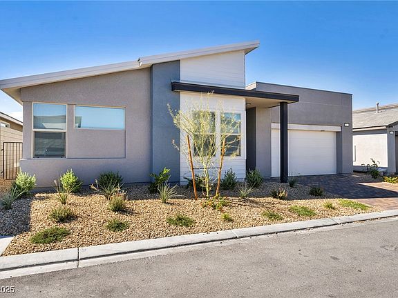 Welcome to this barely lived-in Tripointe home in the gated Alpine Ridge community at Kyle Pointe! Completed in June 2024, this largest Plan 3 model sits within a single-story community at Kyle Pointe and boasts over $126,000 in sleek modern upgrades. Enjoy 10’ ceilings, a disappearing sliding door for seamless indoor/outdoor living, and a gated entry courtyard. The chef’s kitchen features double-stacked espresso cabinets, a waterfall quartz island, chef’s hood, wine fridge, and walk-in pantry. The luxurious primary suite offers vaulted ceilings, an oversized spa-style shower, and a massive walk-in closet connected to the laundry room. 3 additional bedrooms, two full baths, and a versatile den occupy a separate wing for added privacy. Additional highlights include a 3-car tandem garage with EV plug, full home water filtration system, and tankless water heater. Set on a pool-sized lot with backyard views of Mt. Charleston, just minutes from the 95 freeway! 2 parks in community.