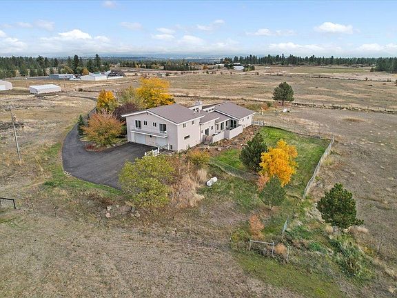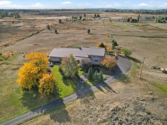 Remarkable, open concept Ranch house sitting on 10 beautiful, scenic acres, close to town! This unique floorplan features over 3500 sq. ft on the main floor with a huge light filled great room with cathedral ceilings. This home is made for entertaining ! Great gourmet kitchen with an 8 foot center island and slab granite countertops. The main floor primary suite includes a full en-suite bathroom with new garden soaking tub and walk-in shower. Each of the additional 3 spacious bedrooms have their OWN private bathrooms, making this home perfect for multi generational living or guests! . The horse set up includes an area for a large round pen corral and a perfect shop for your hay storage with frost-free water and an additional insulated room. The property also includes a rare 4,000 sqft barn for your storage needs. Numerous fruit trees, pleasant views all around, convenient to Spokane, FAFB, Airway Heights, and the airport. No HOA or CCRS- Country living at its best!