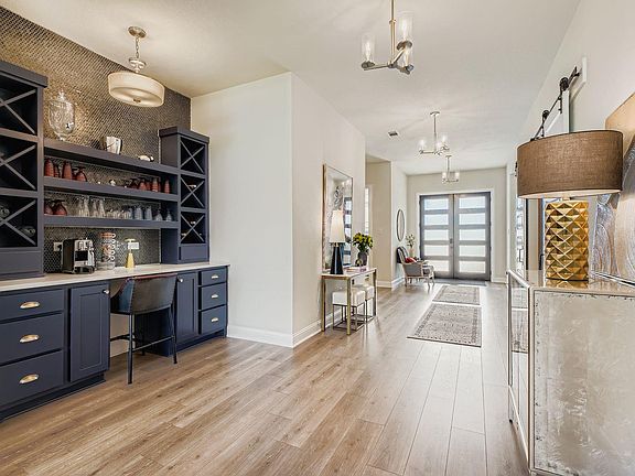 Stunning Eastland II by Drees Custom Homes in the exclusive gated section of Meridiana! This thoughtfully designed one-story home offers 3,622 sq. ft. of luxurious living on a spacious .28-acre lot with a 3-car garage. Step inside to find white oak wood floors throughout the entry, living, office, and media room, paired with custom designer light fixtures that add warmth and style. The spacious family room opens to the covered patio and expansive backyard, ideal for gatherings and outdoor fun. The home features 4 bedrooms and 3.5 baths, including a luxury owner’s suite, a private guest ensuite (perfect for multi-generational living or long-term guests), and two secondary bedrooms joined by a Jack-and-Jill bath. Designed for both entertaining and everyday living, you’ll love the custom built-in bar area, walk-in pantry, and oversized laundry room with plenty of storage. A beautiful media room with custom sconces, gorgeous wood paneled wall perfect for relaxing. With high-quality finishes, smart design, and a sought-after floor plan, this home truly blends elegance, comfort, and functionality. Located in an exclusive gated enclave of the community, residents enjoy enhanced privacy, security, and exclusive amenities in addition to the master-planned neighborhood’s resort-style offerings. These include a world-class gym and fitness center, kids’ waterpark, and a sparkling resort-style pool—offering luxury and leisure for all ages. With high-quality construction, smart design, and a highly desirable floor plan, this home delivers style, comfort, and convenience all in one.