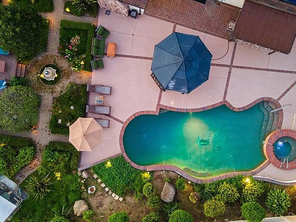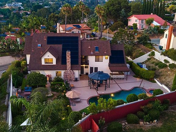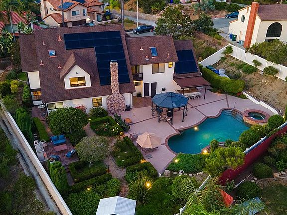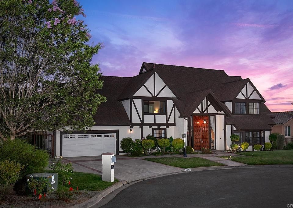 Discover the essence of Mt. Helix living in this exquisite Tudor-style estate on a peaceful cul-de sac. Meticulously crafted, the home features a grand entryway with an arched roof and a beautiful wooden front door. An open floor plan with tall vaulted ceilings and natural light enhances the space. The remodeled kitchen boasts granite counters, stainless steel appliances, and custom cabinetry. The master suite includes a sitting area, sunken tub, and large walk-in closets. Outside, enjoy a tropical paradise with a sparkling pool, spa, built-in BBQ, fireplace, and gazebo. Additional features include a whole house fan, finished garage, RV parking, and Tesla Solar.
