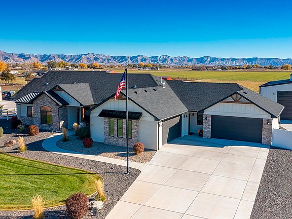 Welcome to this stunning 4-bedroom, 3-bathroom home located in the highly desirable Northwest area of Grand Junction. If you’re seeking privacy and a serene country setting, this property is a must-see! Relax on the covered back porch and take in the breathtaking, unobstructed views of the Book Cliffs and Grand Mesa, or enjoy the Colorado National Monument views from the front of the home. Set on a beautifully landscaped 1.06-acre lot, this home features a full sprinkler system and landscape lighting, ensuring the grounds are as pristine as the interior. Step inside and be greeted by an abundance of natural light flowing through an open floor plan. The gourmet kitchen is a chef’s dream, boasting a gorgeous granite island, soft-close cabinetry, and top-of-the-line GE Monogram appliances, including a six-burner gas range and double ovens. Attention to detail shines throughout, from the tray ceilings with rustic rough-sawn wood beams in the living and dining rooms to the stunning stone gas log fireplace, accented by elegant floating shelves. The spacious master suite offers a luxurious 5-piece en suite bathroom and a walk-in closet. With parking for four vehicles in the attached garages and a massive RV parking area on the south side of the home, there’s no shortage of space for all your needs. The South driveway leads to an impressive 65' x 30' workshop with oversized garage doors, offering 1,950 sq. ft. of endless possibilities. Outfitted with a 60-amp single-phase panel, LED lighting, and ten GFCI-protective outlets, this workshop is ideal for any hobbyist or entrepreneur. Don’t miss your opportunity to see this incredible property. Schedule your private showing today!