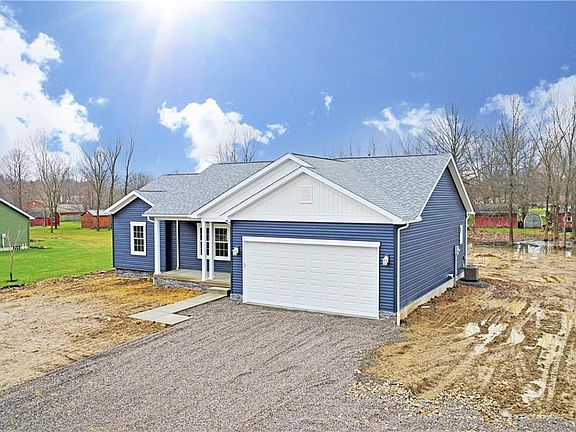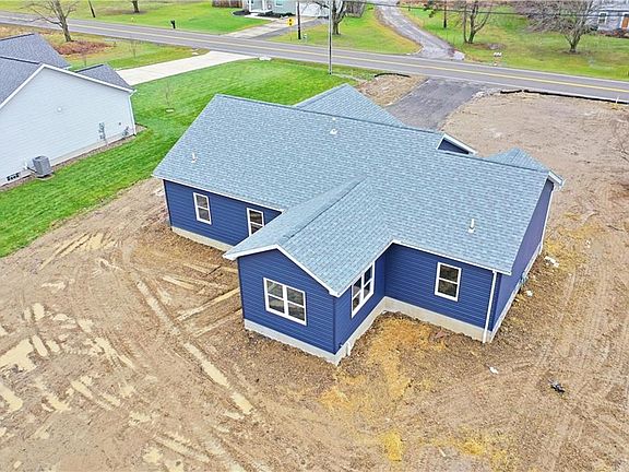 Marvel at this custom construction now available turnkey; offering a delightful three-bedroom layout with an open central floorplan! This move-in-ready residence has it all with its bold looks inside and out, starting with the handsome blue siding paired with bright white accent work. Step inside to find ash colored hardwood style flooring, filling the great room and common area as it sweeps past the kitchen and into a sun-filled gathering room with sliding door access to the backyard. The gorgeous kitchen boasts charcoal colorways and matching appliances high polished luxurious granite countertops glisten under the hanging lights. Hidden first floor laundry leads past the 2 car, insulated and painted, garage with garage door opener. The master bedroom suite. Here, the stepped ceiling wraps around a bright room with recessed lights and a beautiful lighting through out. The master also has a large walk-in closet and decadent private bath with tiled shower. Opposite main living area is a pair of equally impressive bedrooms showcasing upgraded carpeted flooring and personal closet space as they join an additional large full bath. Below, the massive basement has high ceilings offers tons of storage space to include provisions for a third bath with included commode. This is a well built home built for luxury and convenience. One story brand new house living at it's best.