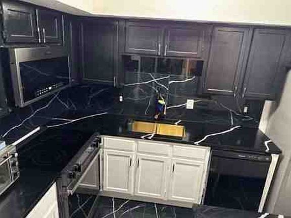 Modern decorative lightingStainless steel appliancesMarble countertopsElegant marble flooring