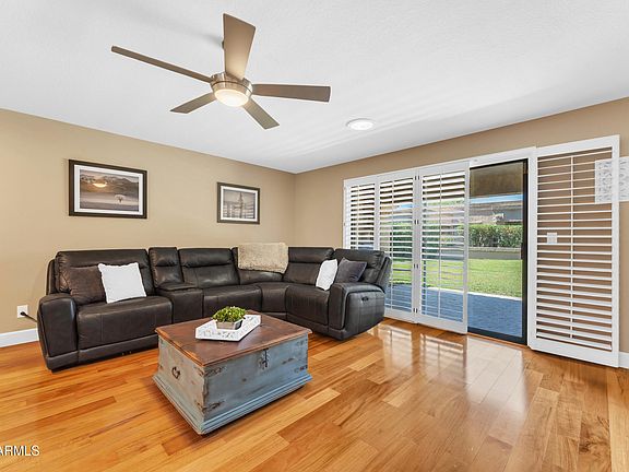 Beautifully Renovated Home Situated on the Lush Greenbelt in Windsor Park at Westbrook Village. Home Features Wood Floors, Shutters, Owned Solar, Inside Laundry, Garage, and Multiple Skylights for Natural Light. Eat-In Kitchen Showcases Full Overlay Soft Closing Cabinets with Pullouts, Stainless Steel Appliances, Granite Counters, Recessed Lighting, and Coffered Ceilings. Spacious 15'6''x13'8'' Primary Suite with Patio Access, Shutters, Wood Floors, Dual Vanity with Granite Counters, Linen Closet, Walk-In Tile Shower, and 5'x6'6'' W.I.C. Guest Bathroom has Soaking Tub with Custom Tile and Upgraded Vanity with Storage. Enjoy Views of Lush Common Area from Stone Covered Patio at Great Room and Primary Suite.  Property is just steps from the Heated Community Pool, Spa, and Fire Pit. Enjoy Windsor Park Poolside & Westbrook Lifestyle with two 18-Hole Championship Golf Courses, Recreation Centers, Fitness Center, Aerobics Room, Yoga Studio, Pickleball, Tennis, Bocce Ball, Sport Courts, Billiard Rooms, Ballrooms, Woodshops, Arts, Crafts, Pottery, Library, Learning Center, Social Clubs, Restaurants, and Much More. Home is Near, Dining, Shopping, Entertainment, Spring Training, Hospitals, Parks, Loop 101, US 60, Loop 303, and I-17.