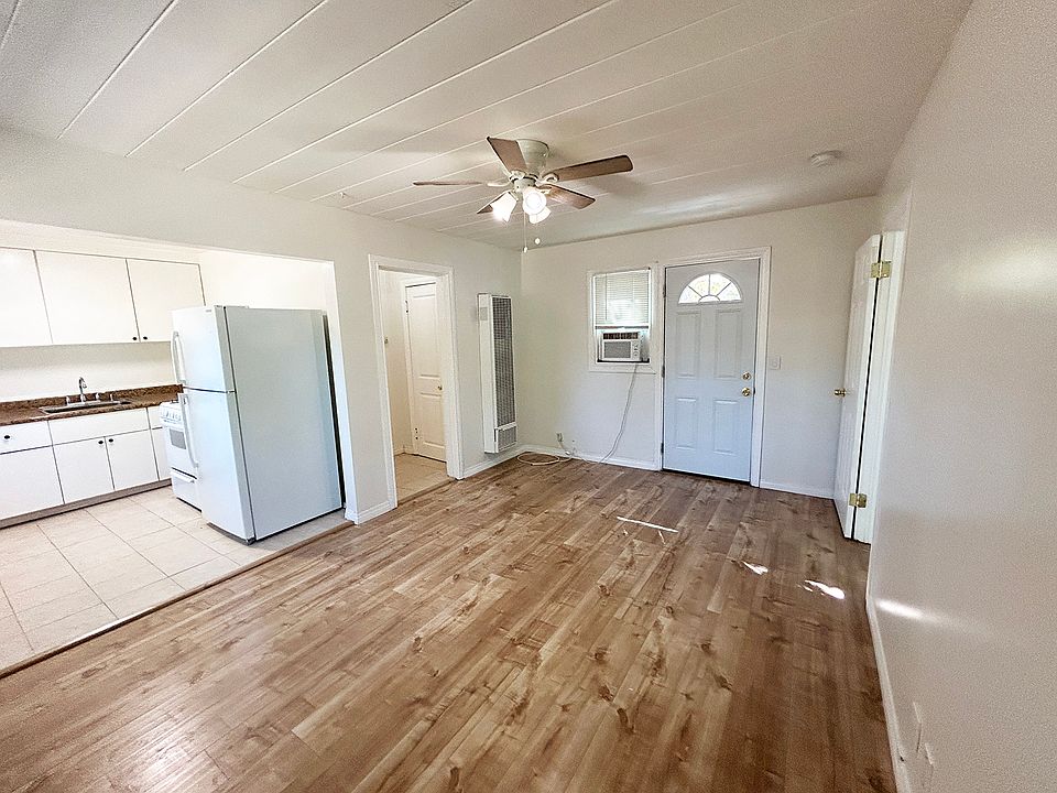 The quiet and serene renovated 1 Bedroom/1 Full Bath comes with full sized washer/dryer, fenced in front and back yards, 2 parking spots, freshly painted with updated engineered hardwood flooring, and new adjustable fans w/lights. The Living Room opens up into the Kitchen with Refrigerator, GAS Stove Top w/Oven, and large cabinets. Windows all around allow for refreshing cross breeze. Tenants can also use the 2 wall AC's or gas heater to get comfortable.