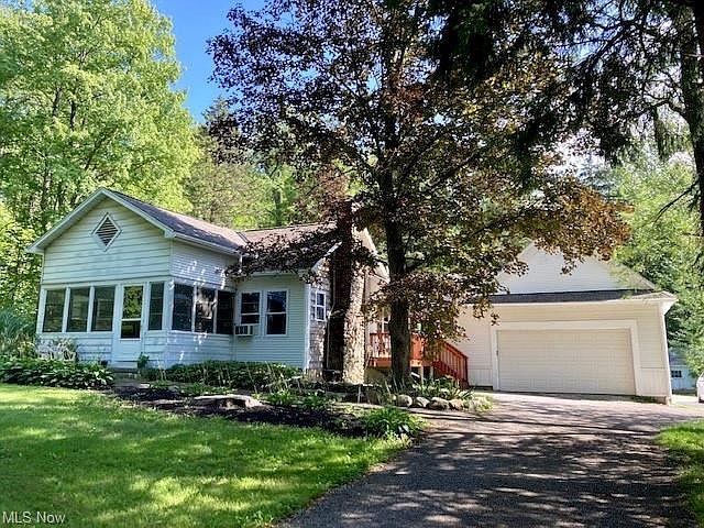 Welcome to this charming Chardon country home, conveniently bordering Kirtland. 3 acres of wooded views. Attached, insulated 3 car garage with 12' ceilings and storage above. An additional detached garage can be found out back, along with an old cottage that needs extensive work. You'll enjoy the large enclosed front porch, and the feeling of sitting among the tree tops. Large living room with wood burning insert stove that can heat pretty much the entire house toasty warm. Eat in kitchen, appliances stay, brand new dishwasher. Master ensuite, is privately located at the back of the home, while the other 2 bedrooms are centrally located and share a full bath. Master Bath has heated floors and a jacuzzi style tub. So many updates over the last 16 years. Windows (except for Master bedroom) have been replaced, mostly 2010 to 2012. Exterior walls insulated, new siding, except for enclosed front porch. Roof 2011. Electrical panel updated to 100 amp. Newly updated full bath. Deck 2014. New Septic in 2006. Close to amenities, Holden Arboretum, many parks, golfing, restaurants, medical, and more! 25 minutes to downtown. Has a hook up for a Tesla in the garage.