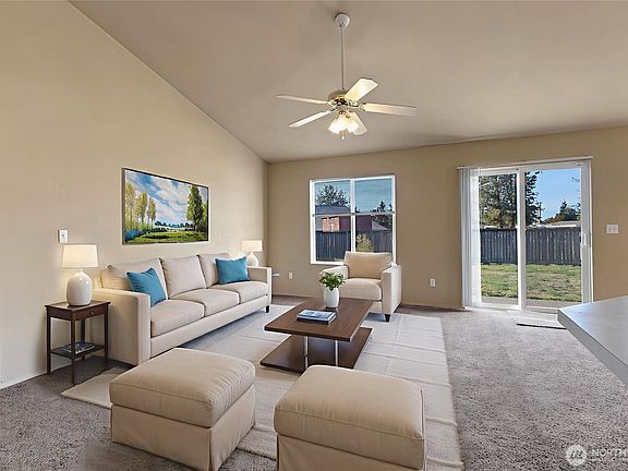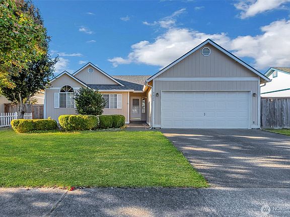 Move-in ready and perfectly situated in the heart of Yelm! This warm and comfortable 3-bedroom, 2-bath rambler offers a welcoming open floor plan filled with natural light, vaulted ceilings, and a skylight that enhances the airy feel. Enjoy peace of mind with a newer roof (2017) and brand-new carpet throughout. The spacious primary suite includes a walk-in closet and full bath. Step outside to a fully fenced backyard with a handy storage shed—ideal for relaxing, gardening, or play. Tucked away on a quiet cul-de-sac and conveniently located less than a mile from Fort Stevens Elementary, shopping, dining, and entertainment, with an easy commute to JBLM. Embrace small-town charm with big-city access—just 30–40 minutes to Olympia or Tacoma!