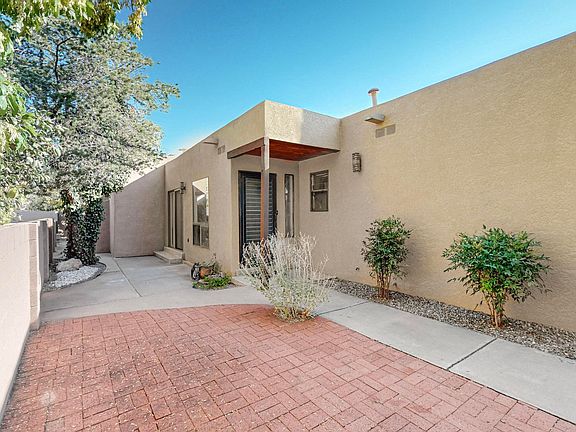 Great Location! Right across from Tanoan! This charming townhome boasts a vast sunken living room w/ gas log fireplace, gorgeous vaulted beamed tongue & groove ceilings, wood look ceramic plank flooring, bar & clerestory windows! Bright kitchen open to the Living room w/ tile & glass backsplash, sky light, abundant recessed lighting, breakfast nook & spacious atrium, open to the sky! All appliances convey. Refrigerated air, laundry service room & sliding doors to access the wrap around patio & beautiful outdoor spaces. Spacious Primary Bedroom w/ Huge walk-in closet, ceiling fan & serene primary bath w/ double vanity, sky light, deep soaking tub & separate shower. Full hall bath w/stylish vanity & tile flooring.