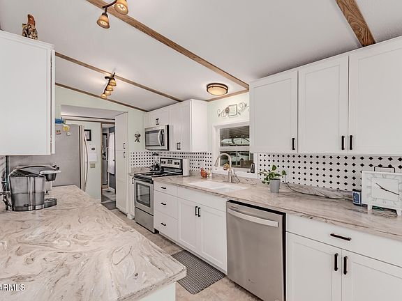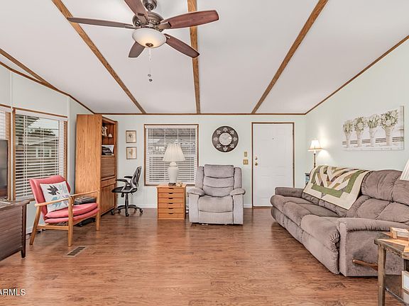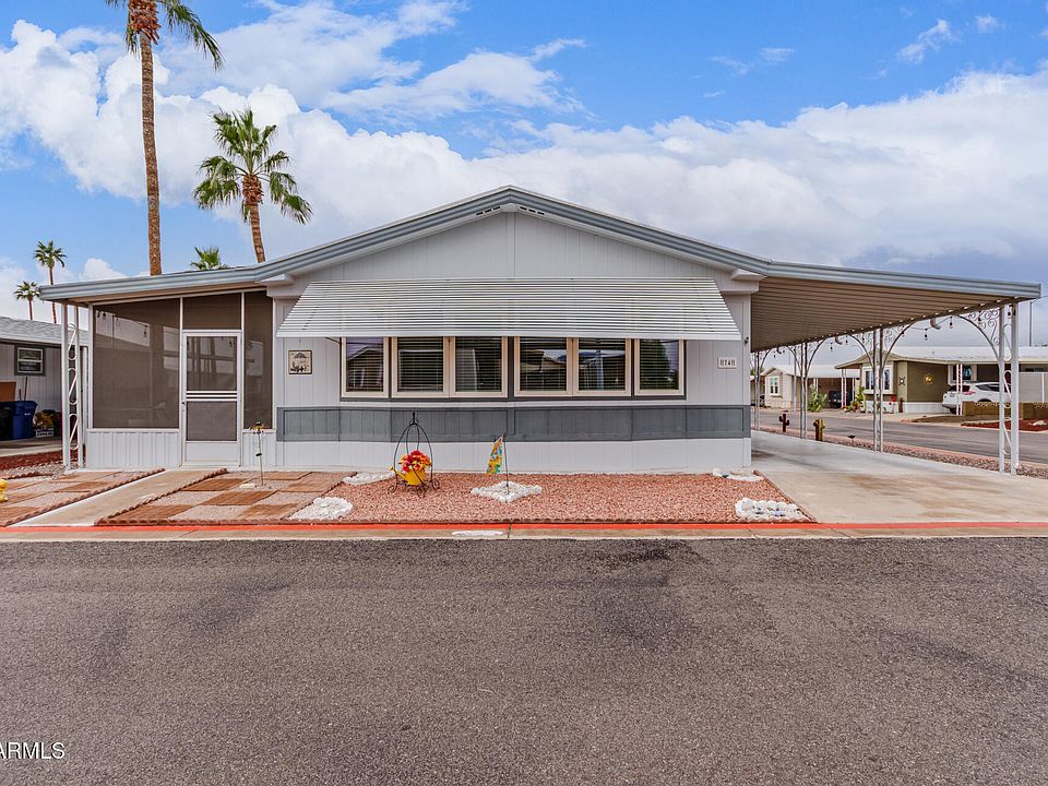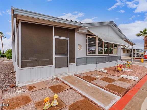 Experience immaculate, updated living in this beautifully maintained double-wide in the vibrant 55+ Rancho Reata community! This super-clean home features all hard floors, all-new windows, and a fully remodeled kitchen that shines with modern style. Step onto your spacious screened-in patio and soak in sunrise views over the Superstition Mountains—the perfect start to every day. Plus, enjoy your very own huge, delicious oranges each winter right from your yard!