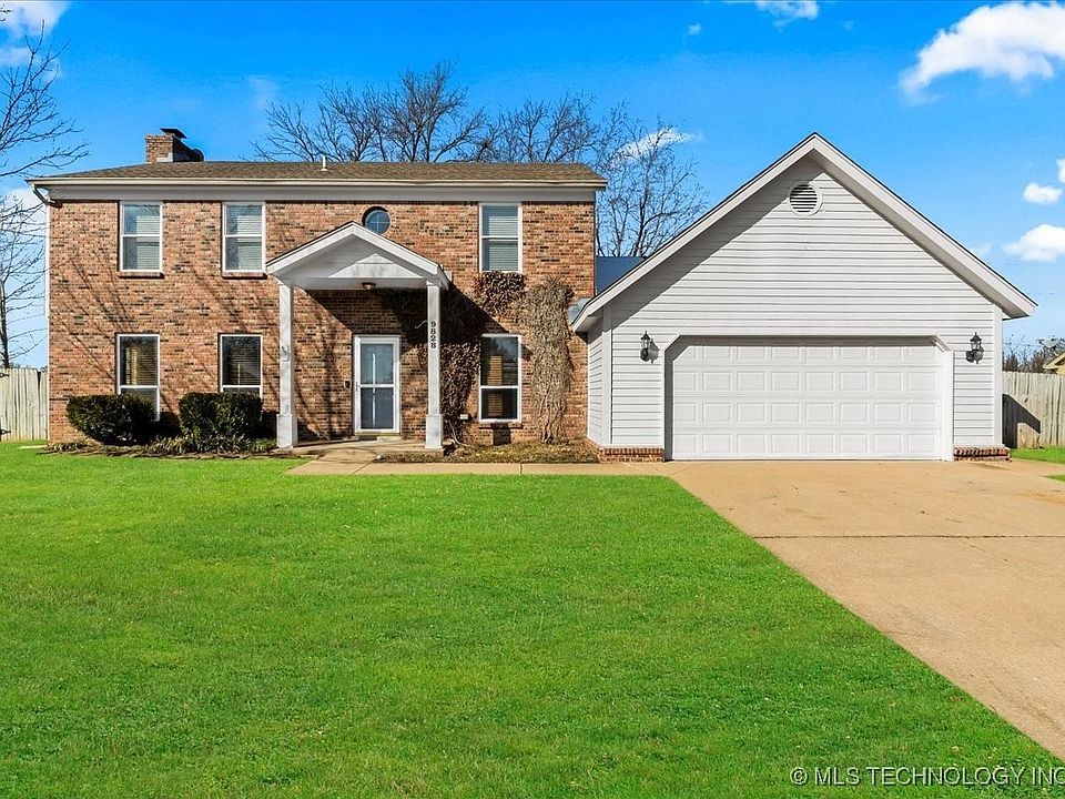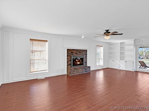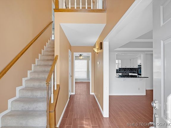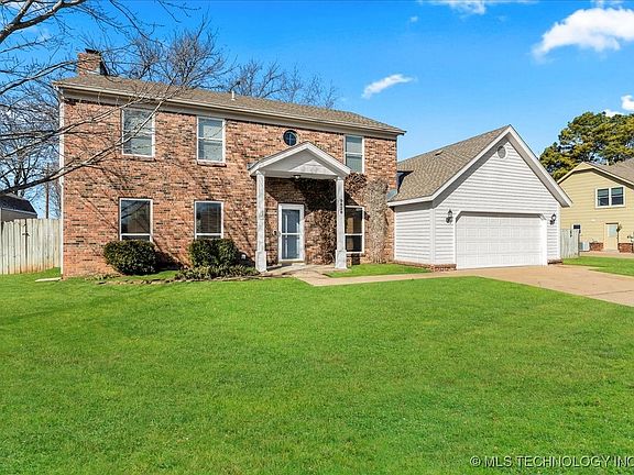 4 beds, 3 full bath, Inground pool, Jenks Schools on approx 1/3 acre. Updated kitchen with granite countertops, eat-in bar, tile backsplash, stainless dishwasher. Updated vinyl windows. Breakfast nook, formal dining, wood burning fireplace in living, vaulted ceiling, crown molding. Updated bathrooms include custom tiled showers. Master bath has soaker tub, tiled shower, double sinks and walk-in closet. French doors in master open to deck overlooking the pool. Private bedroom downstairs. Separate laundry. Fenced yard with mature trees and storage shed. Agent related to seller.