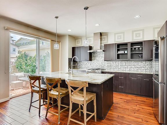 Designer paint touches and gorgeous contemporary details offers a stylish abode near dining, shopping, great schools and freeways for today's modern homeowner. Spacious main floor with open layout Loft area upstairs with 3 bedrooms Modern kitchen with Whirlpool Gold appliances 2-car garage accessed through wise open alleyway Private, enclosed yard with patio, turf area Enter through the contemporary glass and wood five-panel door to enjoy the modern design and convenient location this home offers. Med-dark engineered flooring and dark kitchen cabinets with stainless steel pulls and appliances creates a non-cluttered feel. The large island overlooks the family room area. A large sliding glass door with modern window covering opens to the enclosed patio yard offering natural light and outdoor entertaining space. Great room layout with glass rock gas fireplace is gorgeous and can be configured a variety of ways. Access to the garage is handy. Main floor bedroom near entrance can double as a study. Upper level houses 2 bedrooms that share a full bath with a double sink vanity as well and a master suite. The master is large and has its own bathroom with two vanities, walk-in closet with glass sliding door, and overhead showerhead for pampering. All bedrooms open to an additional loft area for a variety of activities like relaxing, studying or gaming. Upper laundry room with cupboards. The basement level of this home is entertainment-focus with a pool table area, nook, and open second family room. A granite topped bar with beverage cooler and sink is saves a trip upstairs as does the half bath. Extra storage space adds to this home's lives large personality. Highlands Ranch is a vibrant, south Denver suburban community with award winning public schools and a variety of private school options. Dining, shopping and entertainment are plentiful and easy to get to. Light rail, E470 and I25 are all easily accessible. This community includes an HOA who provides a clubhouse, pool, snow and trash removal, tennis courts and a fitness facility.