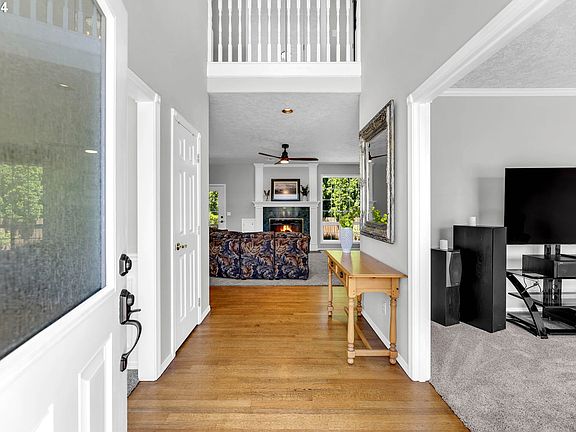 Custom 4brm, 2.5 bath home nestled on 1/4 acre corner lot. Entryway showcases a new front door with matching side panels and huge arched window above, allowing extra light into the home. Beyond the foyer with its' high ceilings, the main floor encompasses a formal dining room, cozy den, generously sized living room with granite gas fireplace and direct access to backyard trex deck. The stylish kitchen boasts immediate hot water, reverse osmosis drinking water system at kitchen sink, gas stove, convection oven, built-in microwave, a good-sized eating area with additional built-in cabinets. A versatile laundry/utility room with sink and extra storage space adjoins the kitchen. Primary bedroom on main floor features walk-in shower, jetted tub, and walk-in closet. Freshly painted, new light fixtures, door handles, new carpets, and hardwood floors. Upstairs three spacious bedrooms await, accented by ceiling fans, one with walk-in closet and others are generously sized. Full bathroom. Central vacuuming throughout the home. Exterior smart technology lighting for customized programming, along with Ring doorbell and security lighting. New shutters, and complete new roof installed in 2021.Landscaped grounds with sprinkler system, lawn areas for play, blueberry bushes, apple tree, raised beds for garden, along with gorgeous Magnolia tree in front. Spacious shed included, and parking pad on side for RV or boat. Oversized garage with extra large driveway. Close to shopping, restaurants, schools, parks, and the Canby Logging Trail renowned for hiking, running, biking. This home is move-in ready and has everything you have been looking for, including a great well-kept neighborhood with No HOA! Don't miss this incredible opportunity to own your dream home in a peaceful setting, perfect for families, outdoor enthusiasts, and those seeking a serene and private oasis to relax and recharge. Schedule your showing today or join us for the Open House Sat June 29th, 1-3.