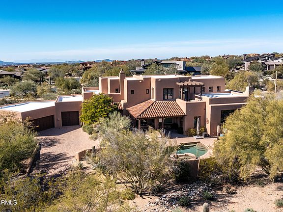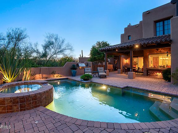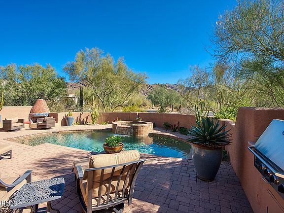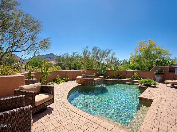 Full of character and grace this desirable custom estate on a cul de sac lot in the heart of guard gated DC Ranch Country Club boasts picturesque mountain views with amazing indoor outdoor living spaces. Inviting entry courtyard opens to Windgate Pass sprawling views to the east with heated pool/spa, spacious covered patio with extended tumbled paver surrounds perfect for entertaining, fireplace/sitting area, and built in BBQ. Well-designed split bedroom plan, with two ensuite bedrooms, one with private entry and patio, with additional en suite third bedroom and den/flex room on other wing downstairs. Charming eat-in kitchen, with spacious honed leather granite island top, and Dacor and SubZero appliances, opens to hearth room and front courtyard living spaces.