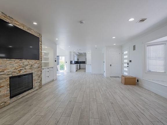 Now available for lease in Sylmar, this newly remodeled 3-bedroom, 2.5-bathroom home offers 2,137 square feet of stylish and functional living space. The open layout features sleek wood-style flooring, a stunning stone-accented fireplace wall with built-in shelving, and modern recessed lighting throughout. The fully updated kitchen is equipped with quartz countertops, high-gloss cabinetry, and stainless steel appliances including a gas range, refrigerator, microwave, and dishwasher.