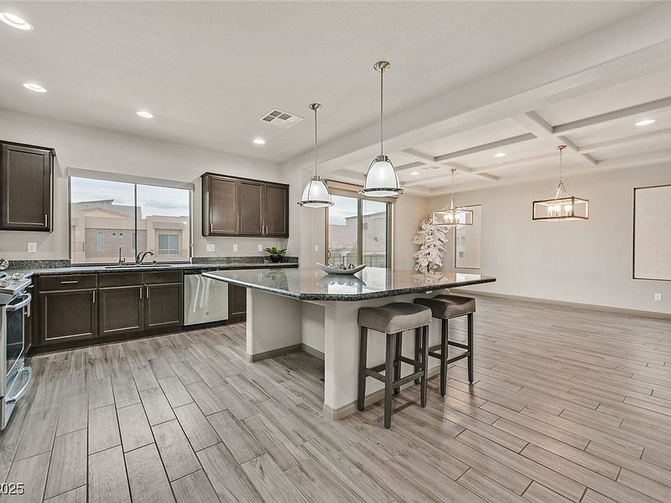 Nearly 5,000 sq. ft. of luxury living for under $850,000!This stunning 5-bedroom, 4.5-bath home is designed for comfort, style, and flexibility. The layout is ideal for multi-generational living. Three of the five bedrooms are ensuite, offering privacy for family and guests. The home feels like new and boasts an impressive kitchen with stainless steel appliances, built-in refrigerator, rich cabinets and a huge walk in pantry.Oversized dining room opens to the spacious living area.The main primary suite offers a spa-like bath with separate tub and shower plus a huge walk-in closet. Enjoy outdoor living on the rooftop deck with incredible Strip Views. Create your own oasis in the pool-sized backyard. Inside, modern finishes shine with wood-look tile floors, sleek stair rails, and a spacious laundry room with craft area. The 3-car garage with epoxy flooring, EV charging, and extensive built-in storage adds both function and convenience. So many extras - this is a must see!