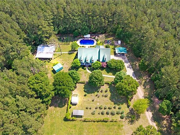 Welcome to your private oasis nestled on 17 acres of serene countryside with an option to buy an additional 33 acres. As you arrive, notice the cross fenced pastures and the tranquil 4-acre pond, a perfect spot for fishing or enjoying peaceful afternoons. Safety and preparedness are paramount here, with a built-in storm shelter, whole-home generator, rain collection system, 220 EV charging station, and solar panels ensuring peace of mind regardless of the weather. Stay connected with high-speed fiber internet while enjoying the convenience of city water. Inside, discover 4 spacious bedrooms and 3.5baths+gameroom and office, all complemented by beautiful hardwood floors that flow seamlessly throughout. The heart of the home is the inviting living area with both a gas fireplace and a wood-burning stove. Explore the blueberry orchard, peach and fig trees or tend to your garden, then cool off in the refreshing pool with a new liner. A barn/workshop provides ample space for equipment or livestock. Relax on the front porch overlooking the blueberry orchard or entertain on the covered rear patio overlooking the pool. The home itself features a durable metal roof and is adorned with warm cypress cabinets in the kitchen, creating a cozy yet stylish atmosphere.
