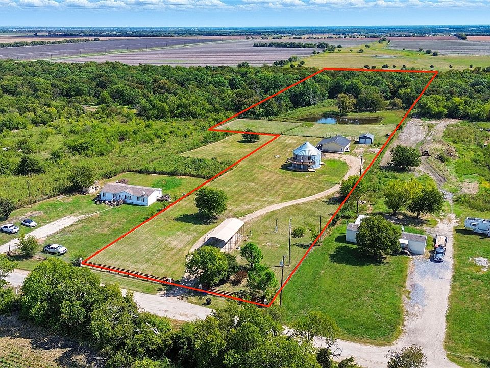 Looking for something truly special? This extraordinary property sits on 8.4 acres with a private pond and offers not one, but two distinct homes, a rare find brimming with character and endless possibilities! The main residence is a charming one-story featuring 3 generously sized bedrooms (one perfect for a home office), gleaming hardwood floors, and an inviting layout with a spacious living area and stacked dining room. The kitchen boasts built-ins, an electric cooktop, and plenty of storage, while the updated bathroom offers dual sinks and a convenient laundry area. Enjoy evenings on the Texas-sized front porch, perfect for rocking chairs and sunset views. With no carpet, oversized bedrooms, and move-in readiness, this home is ideal for everyday living. But the magic doesn’t stop there, this property also includes a second home built from a silo, a true showstopper that blends rustic charm with modern comfort. Inside, you’ll find a farmhouse-inspired kitchen opening to a spacious living room, a large utility room, and a private suite with dual sinks, a walk-in shower, and a bonus flex space for a second living area, game room, or office. Outdoors, a wrap around patio areas create the perfect spaces to entertain, relax, and soak in the peaceful country setting. The land itself is a dream, fenced acreage dotted with mature trees, a tranquil pond, and plenty of open space for recreation, livestock, or future additions. Added perks include a 6-person tornado shelter, two septic systems, RV hookups with awning, and more room for a workshop, pool, sports court, or even another home. This is more than just a property, it’s a lifestyle. Whether you’re looking for multi-generational living, a unique income-producing setup, or your own private retreat, this one-of-a-kind gem delivers it all.