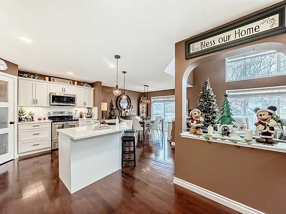 Welcome to this spacious & elegant home in the sought-after community of Hidden Valley. Schools, parks and walking paths make this a family friendly neighborhood, yet it has quick & convenient access to Stony Trail, leading to 'everywhere' you need to go! Over the past few years, this home has undergone extensive renovations including all new kitchen (quartz counters with gleaming white cabinets), new hardware, baseboard and trim, new microwave/hood fan & dishwasher, new carpet upstairs, new light fixtures, brand new, motorized zebra blinds in Living Room and Bonus Room/Office (over $3,000 value for blinds); as well as brand new shingles. The main floor includes a front of the house den/sitting room/dining room, which then leads to the open concept kitchen, dining room & living room. This 'heart of the home' area boasts the large & bright kitchen with island which is accentuated by soaring vaulted ceilings, floor to ceiling windows flooding this area of the home with natural light, gas fireplace for cold winter nights, and deck leading to large back yard where you'll enjoy summer BBQs. Laundry & powder room complete the main floor. Upstairs you will find the large primary bedroom with walk-in closet and 4 piece ensuite. Another hilite of this home is the upstairs bonus room, perfect for office space, home-work room or hang out space. Two more bedrooms & a 4-piece bathroom complete the upper floor. Downstairs contains a HUGE open family room, which can be partitioned for various uses, a 4th room which can be used for office/craft room (or enlarge the window for a 4th bedroom). Double detached garage and spacious back yard make this the ideal family home in a wonderful community. Book your private viewing today!