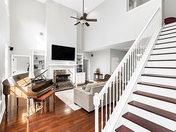 Large garageDramatic staircaseStainless appliancesSpacious floor planMature treesSoaring ceilingsKitchen showcases granite counters