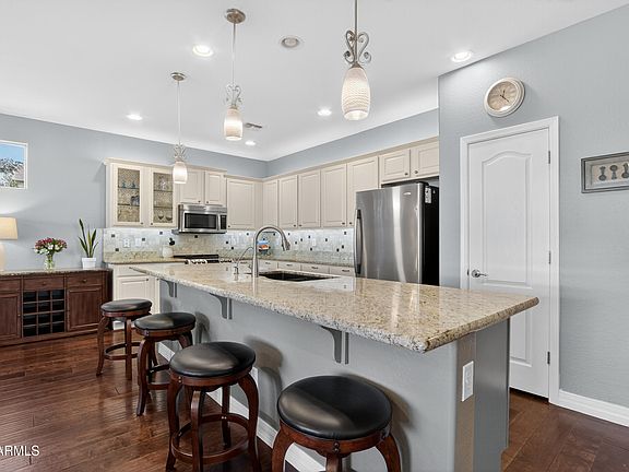 Situated on a desirable corner lot in the heart of Layton Lakes, this beautifully maintained 3 bed, 2 bath home with a den immediately stands out with smart energy efficient upgrades, including paid off solar and a new AC installed in 2024. Inside, the popular split floor plan places the primary suite privately at the back of the home and features a spa inspired ensuite with dual sinks and a walk in shower. The kitchen showcases two tone cabinetry, granite countertops, an induction cooktop, a pull out trash cabinet, and stainless steel appliances with the refrigerator included. Warm engineered hardwood flooring flows through the main living areas, and the 2.5 car garage provides extra space for storage, hobbies, or a small workshop. Additional upgrades include a tankless water heater, whole home filtration and soft water system, custom security screens, and fresh exterior paint in 2024. The washer and dryer are included, making this home truly move in ready. Enjoy low maintenance outdoor living with an extended paver patio and turf perfect for relaxing or entertaining. Residents of Layton Lakes enjoy lakes, sports courts, splash pads, playgrounds, and scenic walking trails, all just minutes from the 202 freeway, shopping, and dining. A wonderful combination of efficiency, pride of ownership, and prime location!