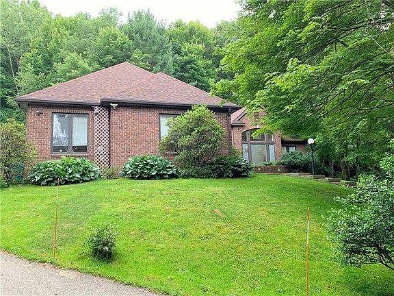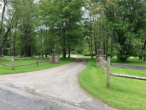 Long private driveway leads to a majestic 3 bedroom brick ranch on 5.9 acres with beautiful pond and stream. The home features a grand foyer with 15 foot ceilings and marble floors. Large kitchen with stainless appliances, Corian countertops, kitchen island, plenty of storage and breakfast nook. The kitchen opens to a cozy family room with gas fireplace. Beautiful windows in living room and dining area, also with marble flooring. Spacious bedrooms, including master bedroom with walk-in closet and en-suite bathroom with large tub, double vanity sinks and separate shower. Den used as office space off the main foyer. Laundry room leads to large garage with bathroom. Huge basement. Back patio for grilling and entertaining includes a fenced in area. A nature lover's paradise!