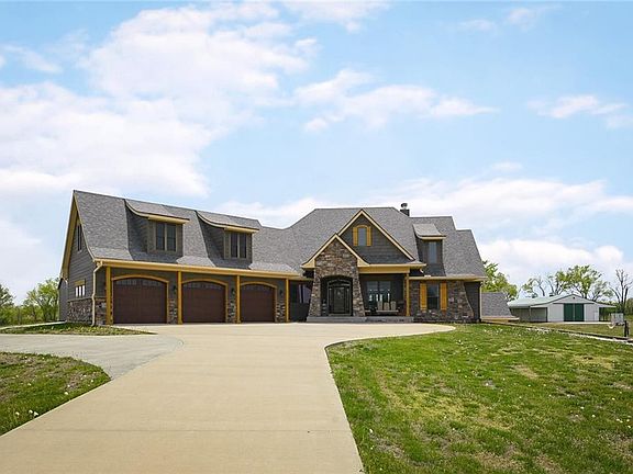 Phenomenal Acreage Package with Beautiful Nearly NEW 6 bed, 5.5 Bath Home, Barn(72x36) with electric & water, 4 Stables, Outdoor Riding Arena, Tool Shed(15x26), 2 Stocked Ponds, on 24 Scenic Acres completely fenced. It's worth the 20 minute drive from Lee's Summit just past Powel Gardens with quick location off 50 HWY to experience this beautiful Country Property perfect for Horses or other acreage Entertainment options. Did I say "Picturesque"! This home is perfectly placed in the middle of the Acreage with Ponds on either side and nearly 40 Addl Trees Planted. (One pond recently deepened so grading to take place once settled). This home has exceptional size with 4 Bedrooms on the Main, 2 Bedrooms on the Lower Level Finished Walkout Basement, and one Huge Bonus Rm (Excercise currently) upstairs. Walk into Soaring Ceilings, Gorgeous Stone F/P, Open Concept to Kitchen that all walkout to a Huge Main Level Patio with Hot Tub. Its almost like having 2 Homes as Lower Level Finish includes a 2nd Kitchen, Family Rm with Stone F/P, 2nd Laundry Rm, Bonus Rm (22x13), and 2 Bedrooms and 2 Bathrooms which walk out to side of home with Large Patio with beautiful Stone Retaining Wall where you can enjoy Pond and Acreage View. This is an Acreage Lover's Dream Home!