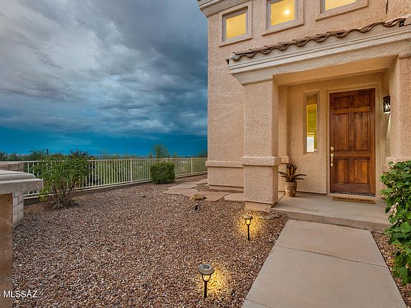 Million-dollar views from this high elevation, premium corner lot located in Sabino Springs, home of the renowned Arizona National golf course. From the back patio of this updated home, enjoy panoramic views of the city lights of the valley below and the surrounding mountains. The home is located on a very private 4-home cul-de-sac street at the top of the subdivision. An impressive entry leads to the great room with formal dining area which has several large picture windows that provide magnificent views. This move-in-ready home features travertine flooring and a dual sided gas fireplace. Renovated kitchen with contemporary design has custom cabinets granite counters, stainless steel appliances, new custom tile backsplash, pantry, and a center island with a breakfast bar. The kitchen .. opens up to the family room featuring a beautiful gas fireplace. This is the ultimate lock & leave residence w/ low-care yard spaces. One bedroom and full bath downstairs and an en-suite guest room and the primary suite upstairs. Primary suite w/ big walk-in closet, a private deck and a luxurious, spa-like bathroom features marble quartz counters, dual-sink vanity, floor-to-ceiling tile surround shower w/ upgraded fixtures & travertine floors. 2- car garage, water softener, and NEW HVAC system. Other recent additions include a new sun shade and updated landscaping.