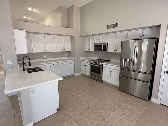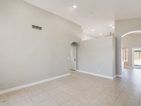 Open-Concept Living Area High vaulted ceilings and fresh new paint throughout create a bright, modern feel. Large neutral tile flooring ties the home together for a clean, elegant look.