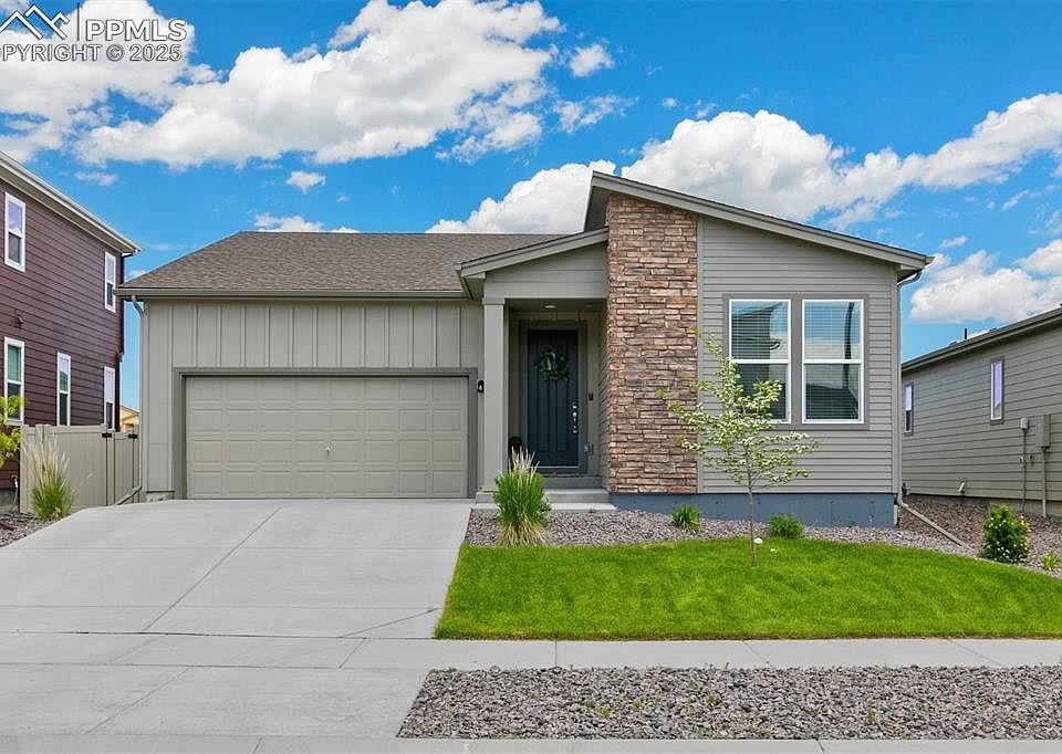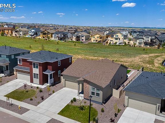 HUGE ranch plan, just TWO YEARS OLD! Backing to OPEN SPACE with NO REAR NEIGHBORS! This lovely ranch home is LARGER THAN IT LOOKS!! OVER 3800 SQ FT with 4 BEDROOMS, 3 BATHROOMS, and a PARTIALLY FINISHED BASEMENT and even MORE ROOM TO EXPAND! It is in absolutely PRISTINE CONDITION and IMPECCABLY CLEAN! Abundant natural light throughout! Beautiful and bright gourmet kitchen with 42” WHITE CABINETRY, QUARTZ COUNTERTOPS, a LARGE ISLAND with single basin sink, a WALK-IN PANTRY and STAINLESS STEEL APPLIANCES including GAS RANGE and french door refrigerator! True open concept layout between the kitchen, large dining area and living room. The CUSTOM FLOATING GAS FIREPLACE and tasteful DESIGNER ACCENT WALL add a stylish elegance and decorator charm. Two spacious bedrooms and a full bathroom can be found towards the front of the home, while the master suite is thoughtfully located towards the back of the home for privacy. The master bedroom features an ensuite 5 piece bathroom with dual vanity, and a VERY LARGE walk in closet. The partially finished basement offers a great space for entertaining with a spacious recreation room, one additional bedroom and bathroom, plus nearly 900 sq feet of unfinished storage space that can easily be used for a home gym, future basement expansion or even a new theatre room! Expanded patio and fully fenced no-maintenance rear yard back up to a community greenbelt area. Central AC, main level laundry, washer/dryer, auto sprinklers, and more. Everything from roof to HVAC components to all appliances are only TWO YEARS OLD! This home has been lovingly cared for and is totally move-in ready! Located in the desirable Meridian Ranch Golf Course community with tons of amenities including schools, fitness/rec center, indoor/outdoor pools, trails, nearby parks, playgrounds, restaurants and shops. Near Antler Creek Golf Course and Clubhouse. EZ access to Peterson & Schriever. MUST SEE!!