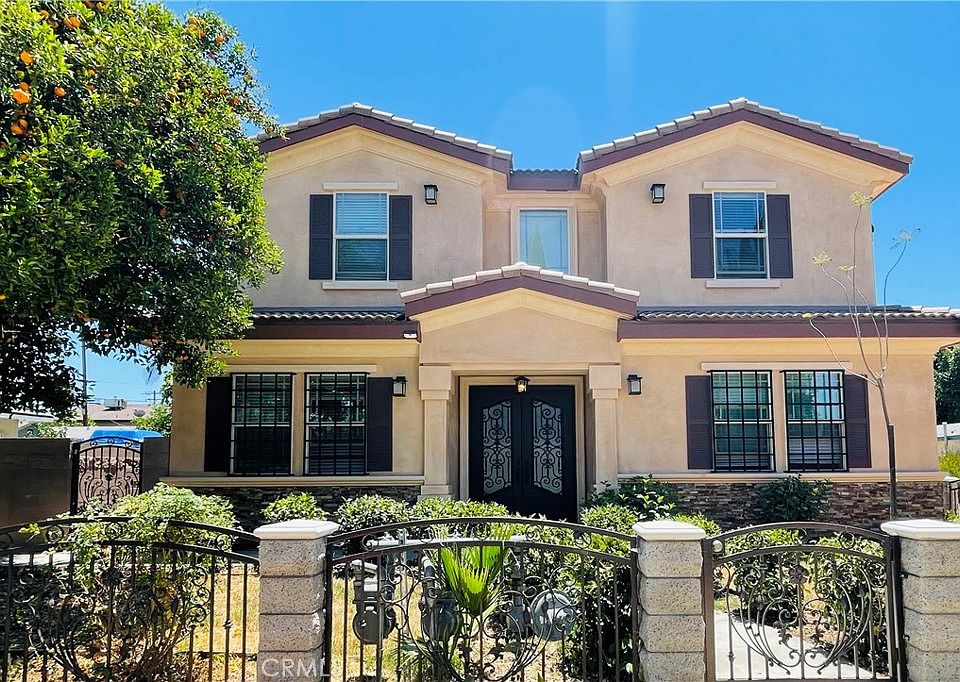 Built in 2021. Low tax and No HOA. Iron fenced front yard features a fruitful mandarin orange tree and a courtyard. Wrought iron glass front door opens to this 2021 new-built two-story house that features 5 sizable bedrooms with one bedroom and one full bath downstairs. The owner added a metal security sliding door and metal security window grills. 4 bedrooms are upstairs with 2 full bathrooms. The upstairs spacious main bedroom features a luxurious walk-in closet, which adds to the comfort and style of the home. A small backyard is enough for a holiday BBQ. A tankless water heater is also installed on the property, to provide a compact, safer, and more modern alternative to the typical water heating system. The 3-car garage space and additional guest parking spaces provide ample parking for visiting guests. This lovely home is also within minutes of the 60 and 10 freeway with shopping and dining close by allowing for convenient living.