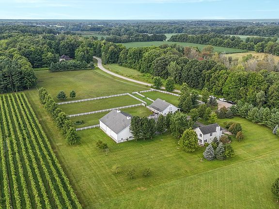 MOTIVATED SELLERS! Located in the heart of SW Michigan's wine country is this gorgeous 6-acre property tucked away on a private cul-de-sac. Store your RV in the 75x60 drive-thru pole barn with 4 overhead doors & a heated 26x40 workshop. Your animals will be comfortable in the 36x48 stable equipped with a tack room, loft, 1/2 bath, 6 stalls with rubber floors & access to the fenced-in pastures. The interior features 4 bed/3.5 bath & a flexible floor plan with 2 primary suites (1 main/1 upper), both equipped with private baths & walk-in closets. Laundry hookup is located on all 3 levels. The kitchen offers stainless steel KitchenAid appliances and access to the back patio. Spend time relaxing in your 3-seasons room or around the designated fire pit area. This property is a must-see!