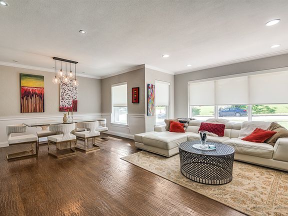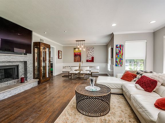 Home features a contemporary Living Room with Hand Scraped Hardwoods, Remote Controlled Shades and a Painted