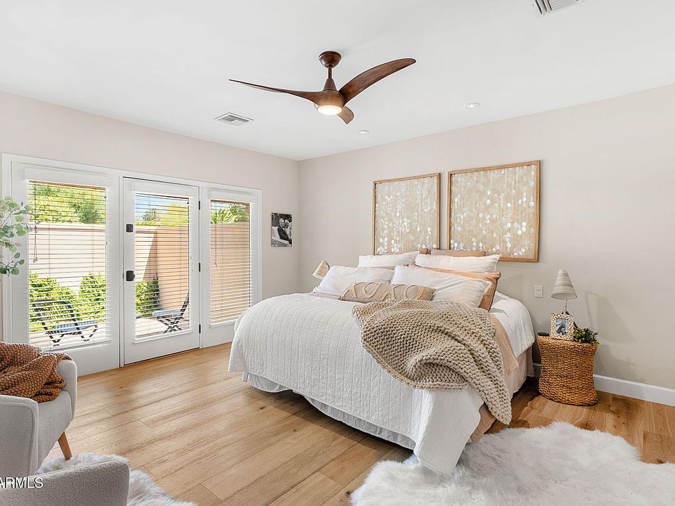Welcome to your dream oasis in Scottsdale Ranch! This stunning single-family home epitomizes the timeless elegance of Santa Barbara architecture. Enter through an iron gated courtyard with a thick ivy-covered entry wall that introduces the charm inside.Blending traditional and contemporary design, each corner boasts charming textural details. Upon entry, beamed & vaulted ceilings adorn an open concept living area, complete with a built-in bar. Hardwood floors add warmth, while the wood-burning fireplace provides a cozy focal point. Offering a split floor plan including a large primary suite with private courtyard. The captivating outdoor space includes a lush garden, citrus trees, sparkling pool, adobe fireplace, built-in grill, and a putting green for relaxing afternoons!