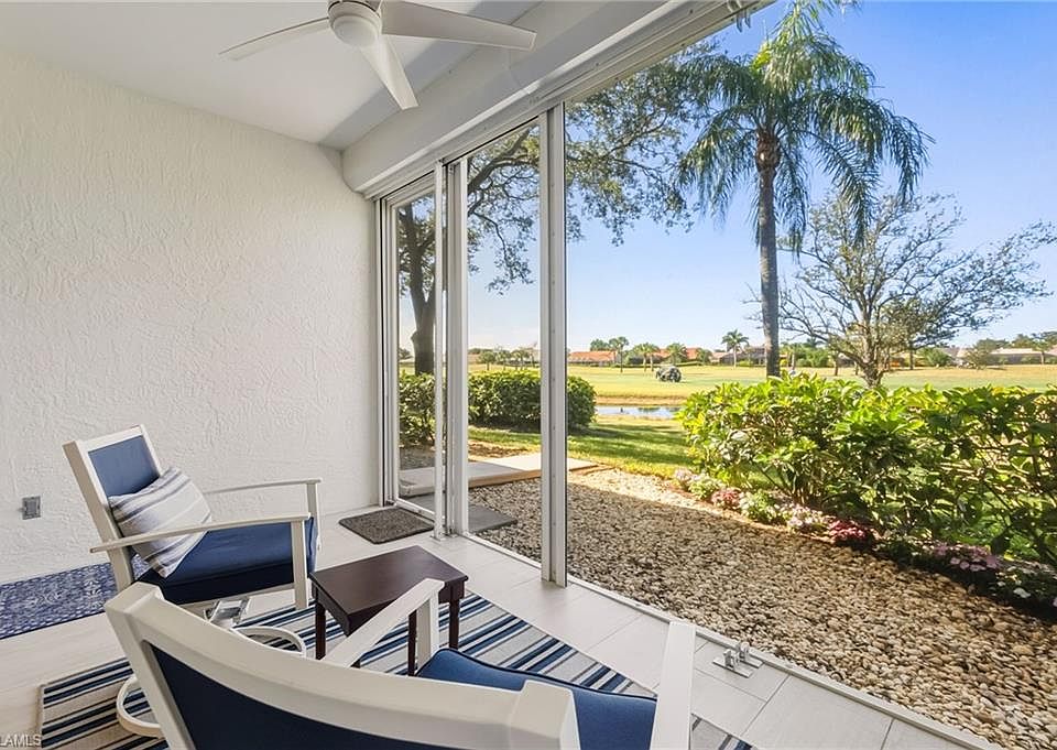 Step into this stunning, newly renovated, first-floor 2-bedroom, 2-bathroom coastal retreat, completely transformed with high-end finishes and thoughtful design. Flooded with natural light from its desirable western exposure, it offers serene pond and golf-course views within one of Bonita Springs’ most coveted communities. The updated kitchen features recessed lighting, a coffered ceiling, soft-close cabinetry, gleaming quartz countertops, an undermount sink with a new designer faucet, a stylish backsplash, under-cabinet LED lighting, and stainless-steel appliances. Both bathrooms have been upgraded with new vanities topped with quartz countertops, frameless glass shower doors, handheld showerheads, and elegant new fixtures. Porcelain tile flows seamlessly throughout the entire unit, complemented by fresh paint, new baseboards, brushed-nickel hardware, designer ceiling fans, and modern light fixtures, new impact windows and window treatments. Enjoy the Spanish Wells lifestyle with optional golf, tennis, bocce, pickleball, and clubhouse amenities just steps away. Perfect as a full-time residence, seasonal escape, or investment property, this move-in-ready home is offered turnkey. It includes a one-car garage, complete with an included golf cart—truly coastal living at its finest. Don’t miss this exceptional opportunity. Schedule your private showing today!