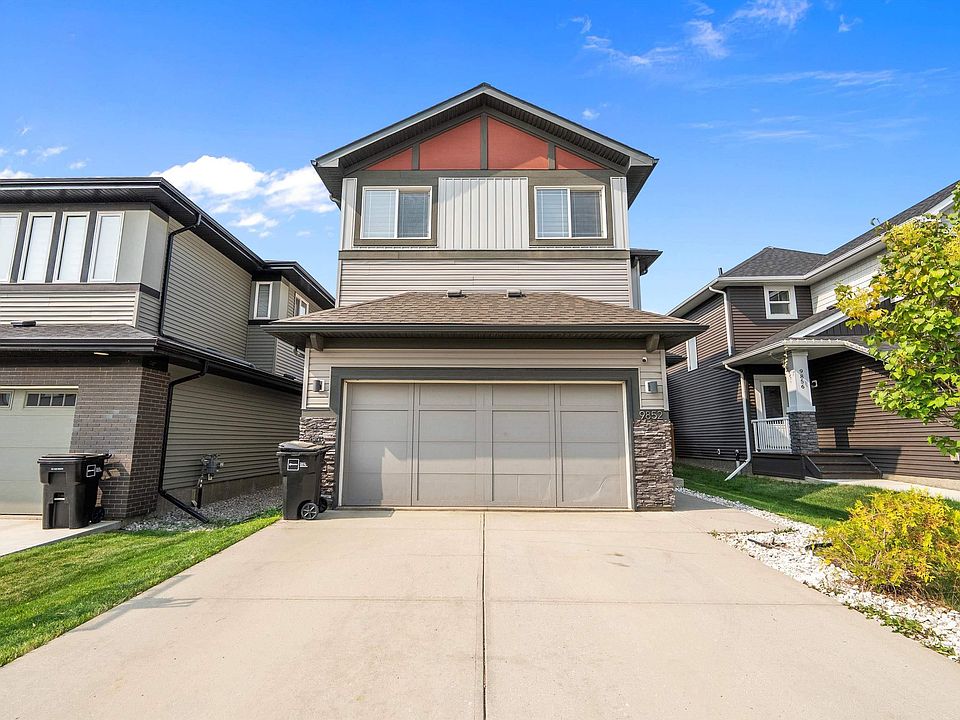 Welcome to this stunning family home in the highly desirable community of Secord! Featuring 5 bedrooms and 3.5 bathrooms, this property offers plenty of space for growing families. The main floor boasts 9-foot ceilings, hardwood and ceramic flooring, and a Chef’s Kitchen with stainless steel appliances (including a gas stove), granite countertops, large island with eating bar, and full-height cabinets with crown molding. The open living room with electric fireplace creates the perfect gathering space. Upstairs, enjoy a spacious bonus room with fireplace, a convenient laundry room, and a luxurious primary suite with 5-piece ensuite, dual vanities, soaker tub, and separate shower. The finished basement includes 2 more bedrooms and a full bathroom—ideal for family or guests. The beautifully landscaped backyard with multi-tiered deck and patio is perfect for summer BBQs and entertaining. Close to the Henday, schools, parks, and transit, this home combines comfort and convenience in a fantastic location.