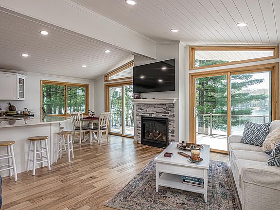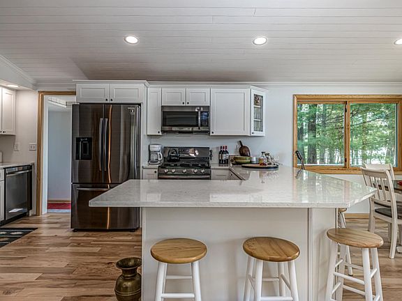 Stunning newly remodeled and redesigned home with gentle slope frontage on Bolger Lake AND McNutt Lake, a private lake! Main floor boasts open concept all new spacious kitchen with quartz countertops, dining & charming living rm with vaulted ceilings, new gas fireplace and SW exposure of beautiful Bolger Lk. You will love the all new primary bedroom with private bath, walk in closet with laundry featuring a ventless dryer. Walk out lower level provides large third bedroom with coffee bar and sitting area, full bath, bonus rm and 2nd laundry. Perfect layout for two families to enjoy privacy on each floor. In addition, this home also has an all new wrap around deck constructed of composite material overlooking the lake. The large entry way with a custom built-in closet system, leads you to the attached heated 2-car garage, paved driveway & shed for additional storage. Remodel facts include: completely rewired, new roof, new hot water heater, skylights, all new insulation and windows.
