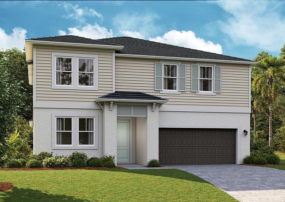 Under Construction. Welcome to the Coquina, a two-story masterpiece with a modern design. This spacious floorplan offers 5 to 6 bedrooms, 4 bathrooms, and a 3-car tandem garage, perfect for growing families or those who love to entertain. At the front of the home, a private bedroom and bathroom serve as the perfect guest suite. A laundry room is conveniently located in the extended foyer which opens up to the heart of the home. The kitchen, featuring 42" upper cabinets, stunning quartz countertops, stainless-steel appliances, and a large kitchen island overlooks the open living and dining areas. Sliding glass doors lead to the large lanai, providing a seamless transition to outdoor living. The owner's suite is tucked away at the back of the home, offering a serene oasis with double vanity, a freestanding tub, a walk-in shower with floor to ceiling tile, and an oversized walk-in closet. Upstairs, you'll find 3 spacious bedrooms, 2 full bathrooms, a flexible recreation space, and an office or optional 6th bedroom. With modern conveniences throughout, like the smart thermostat with voice control, the Coquina is a home designed for bold living. Find the perfect balance of serene landscapes and modern amenities at Mirada. Homeowners at Mirada enjoy the beach lifestyle in Pasco County with a 15-acre man-made lagoon for swimming, kayaking, paddle boarding, and relaxing. Golf cart paths and spacious sidewalks invite residents to explore opportunities for outdoor recreation, including parks, playgrounds, and nature trails. Stay close to what’s important at Mirada, ideally located 30 minutes from Downtown Tampa and just minutes from Publix. From high-speed action—including super-fast ULTRAFi Wifi--to leisurely strolling or floating, at Mirada you can live life to the fullest. Images shown are for illustrative purposes only and may differ from actual home. Completion date subject to change.