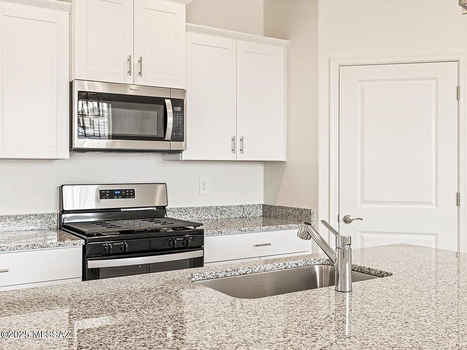 Spacious two-story layoutWhite cabinetsWhite quartz countersLight beige tileCool neutral carpet