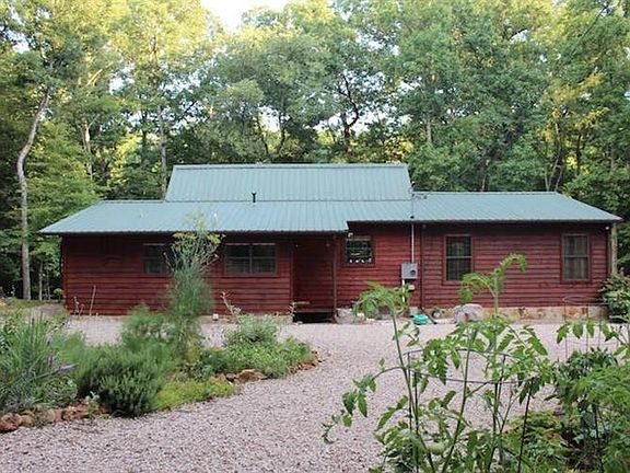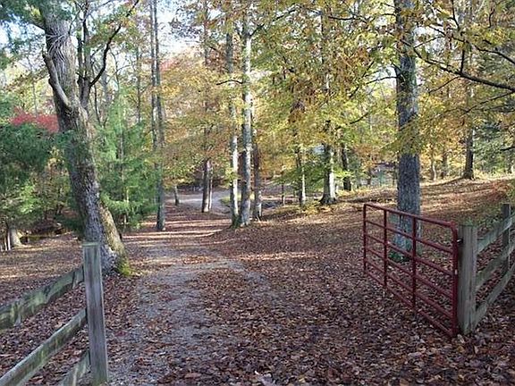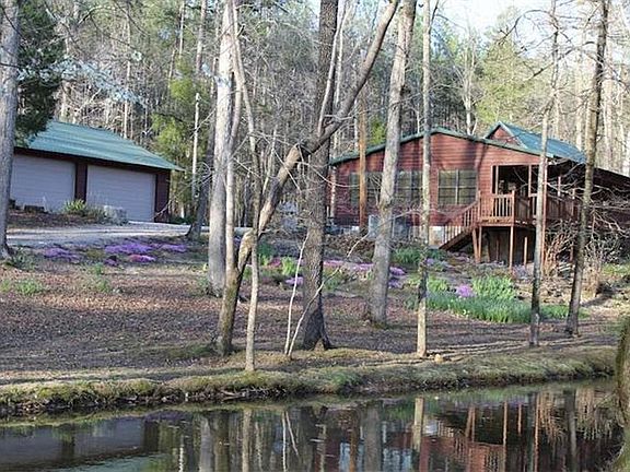 Custom designed home overlooking beautiful creek with rock formations w water flowing over them, wooded, private. This is your getaway! Original cabin was only 600 sq ft, over 1000 sq ft was added. Master bedroom and bath w large tub, heart of pine floors. 2 bedrooms, 2 baths and spacious Great Room and Family Room. Outside you have huge garage w 4 bays and workshop wired for 220 and 110. Would make great wood working shop. Garden area. Relax at end of day on your covered 8x60 front porch.