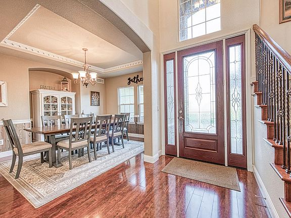Large center islandGrand entryAmple cabinetryPrivate gated clovis estateFormal diningCovered patioRich hardwood flooring