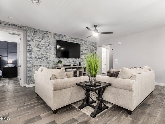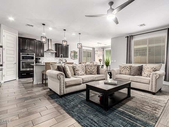 Welcome home to this beautifully finished 3 bed, 2 bath home in heart of Eastmark. From the moment you step inside you feel the open layout and thoughtful design touches make the home feel welcoming. Charming board and batten accents and tasteful wallpaper add personality and style, while the kitchen shines with 42'' upper cabinets and a tile backsplash that elevates everyday living.