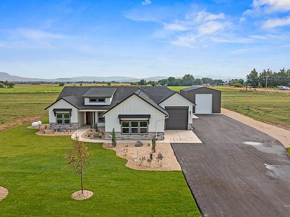 Welcome to this exceptional brand-new custom home set on 5 fully irrigated acres in one of Emmett’s most desirable areas. Designed to capture the stunning views of Squaw Butte, this property immediately impresses with a 24' x 40' shop, an RV bay with dedicated RV plug, and a smooth paved driveway—providing the ideal setup for equipment, trailers, toys, and all your hobbies. Inside, the thoughtfully crafted floorplan features 3 bedrooms, 2 bathrooms, a dedicated office, and a welcoming entryway. Quality finishes throughout blend comfort, function, and modern style, creating a space that feels both elevated and inviting. With wide-open land surrounding the home, this acreage provides a blank slate to bring your vision to life—perfect for animals, additional outbuildings, gardens, pastures, or customized outdoor living. Enjoy true Idaho living with a covered patio ideal for relaxing or entertaining, all while being just minutes from town amenities yet surrounded by the tranquility of country living.
