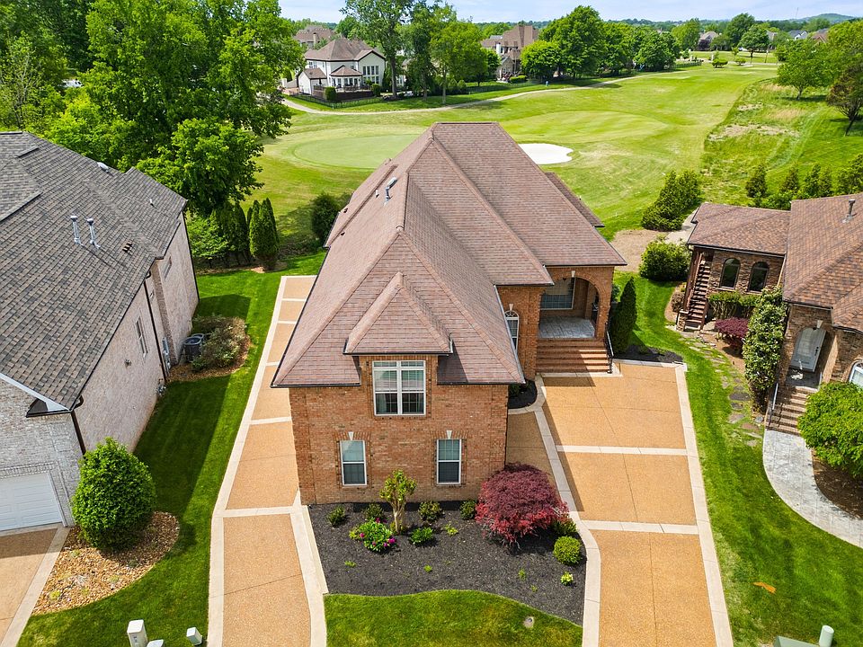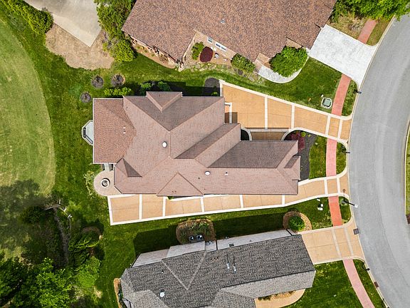 Overlooking the 3rd green of the golf course, this incredible home offers spectacular sunset views with view of the cove. Double drive with two car garage on main floor, separate drive with garage door that opens into finished walk out basement offering half bath, wet bar, additional storage, mud room and STORM SHELTER. Main floor offers spacious, entertaining flow with double doors that walk out onto a covered terrace overlooking the golf course. Great room with built inn's and gas fireplace. Separate formal dining, lovely kitchen for the one who loves to cook equipped with gas range, built in oven and much more. Breakfast nook surrounded by huge windows and gorgeous views. Relaxing primary suite with double vanities, built inn's, separate soaking tub and gorgeous walk inn shower with dual shower heads. Large walk inn closet that opens into utility room. Two driveways, two separate garage entrys to accommodate the many drivers within your household.