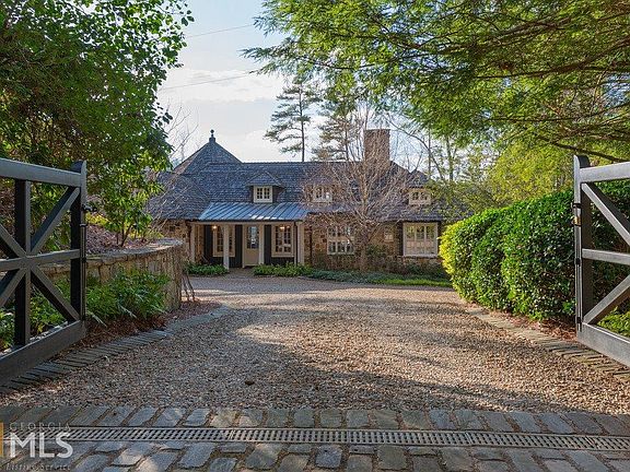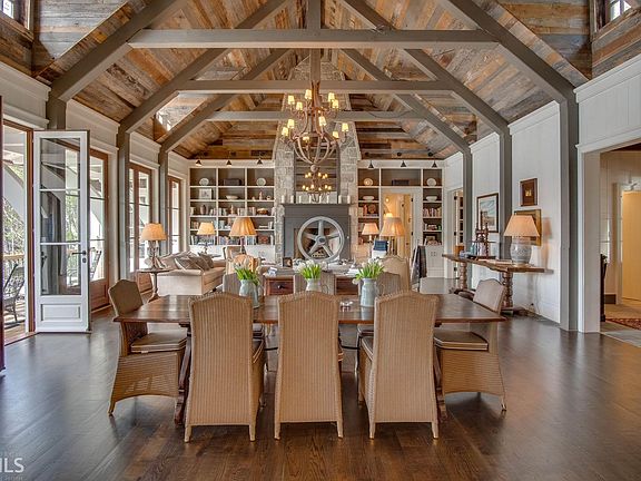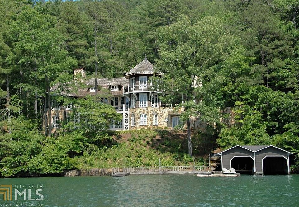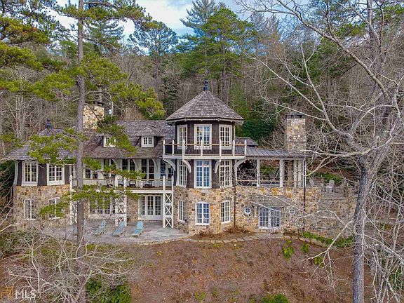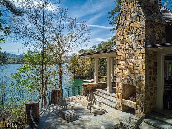 Designed by celebrated architect Yong Pak and built by Chris Clay of Clay Contracting, this impressive 5 bedroom, 5 full bath and 2 half bath Lake Burton residence combines exquisite craftsmanship with coveted mountain sunset views. The great room features a vaulted barnwood ceiling and stone fireplace flanked by built-in bookcases. A generous dining area and wall of French doors lead to a lakeside rocking chair porch. The professional chef's kitchen boasts Calacatta marble countertops with Wolf and Sub-zero appliances, a wet bar with icemaker, beverage cooler and stem wear dishwasher, walk-in pantry and dining nook. French doors from the kitchen lead to a covered lakeside patio with plenty of space for dining, lounging and grilling around the double sided outdoor fireplace while enjoying long range mountain and sunset views. The main-floor owner's suite comes complete with a fireplace, lake views, and a sumptuous spa-like bath with heated marble flooring, freestanding tub and steam shower. A home office, laundry room and 2 powder rooms complete the main floor, along with access to a crow's nest reading room/office overlooking the lake. On the terrace level, a family room with a stone fireplace includes a wall of built-in bunk beds with access to a full bath. A second terrace level family room and game area is equipped with a wet bar with sub zero refrigerator/freezer column and ice maker. French doors open to a pathway leading to the 2-stall boathouse. Two private guest bedrooms feature en-suite baths and French doors leading to a lakeside patio. Two additional guest bedrooms share a spacious bathroom, one with access to a lakeside patio.