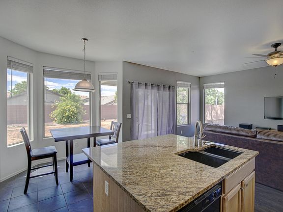 The kitchen is both functional and stylish, equipped with sleek black appliances, granite countertops, a center island, and ample cabinet space perfect for meal prep and entertaining. The open-concept layout allows for seamless flow between the kitchen, dining, and living areas, making it easy to stay connected with family and guests.