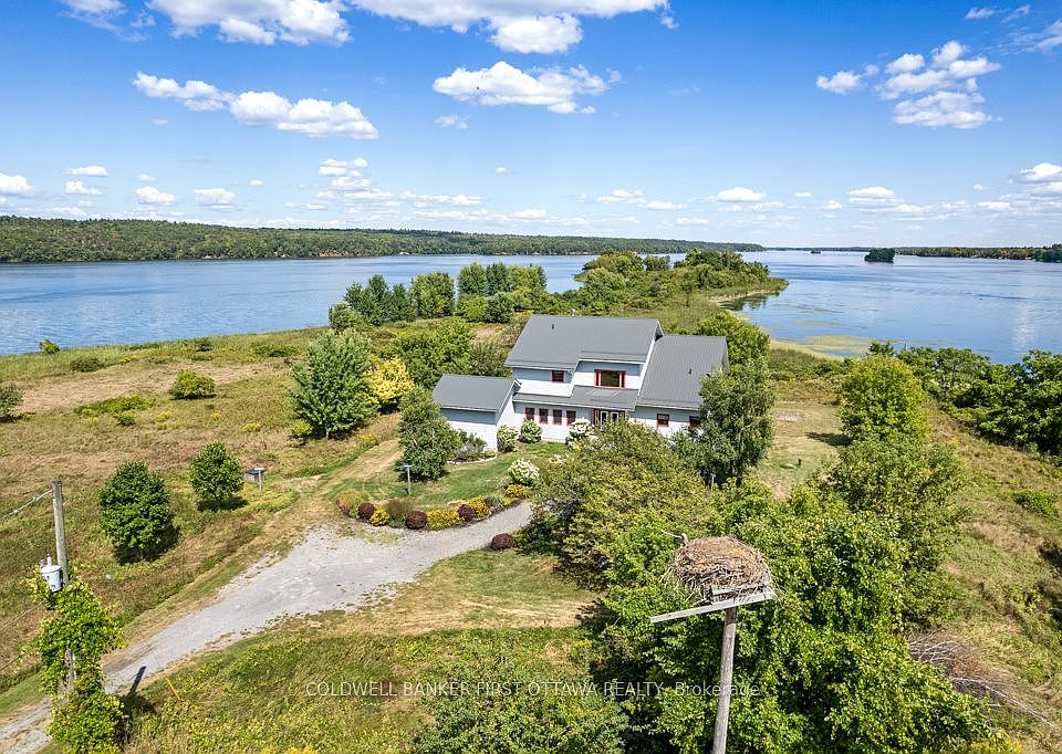 On Upper Rideau Lake, private peninsula with 19 acres, 3,860 feet waterfront and visits from herons, ospreys, ducks and geese. The big and beautiful walkout bungalow is exquisite. Lush colorful perennials follow the walkway to front porch where wide eye-catching double doors are most welcoming. Grand foyer has soaring 24' ceiling, elegant chandelier and convenient coat closet. The 4+1 bedroom and 7 bathroom home offers endless space, including four bedrooms with their own spa-like ensuites. Living-dining room wood-burning fireplace accented with a slate hearth. Full wall of windows provide you with phenomenal views. Gourmet kitchen clear sightlines and tasteful style with shaker cabinets, long 9' island-breakfast bar, 5-burner stove plus huge casement windows framing scenic outdoors. Three-season sunroom features cascading Weatherall windows, patio doors to screened porch and another set of patio doors to huge deck. Main floor powder room and three bedrooms, each with ensuites. One of the bedrooms opens to screened porch. Entire second floor palatial primary suite with vaulted ceiling, propane fireplace and wall of windows overlooking lake. Primary suite also has balcony, walk-in closet, 5-pc ensuite double-sink vanity, glass shower & soaker tub. Walkout lower level, built above ground with large windows, so it's full of light. Lower level familyroom, bedroom, 3-pc bath, laundry centre and door to attached equipment-storage garage. Home has new 2022 metal roof & exterior hi-end CanExel siding. Generac generator. Walking trails meander thru the peninsula and go by numerous varieties of apple trees. One side of the peninsula has 2023 dock with clear waterfront for swimming. Other side natural setting attracting song birds and chirping frogs. Located on paved township maintained road, with mail delivery and garbage pickup. Hi-speed and cell service. Just a walk to Westport or 25 min drive to Perth.
