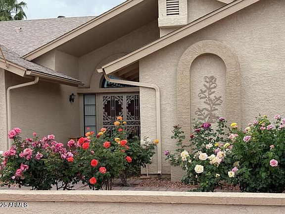Welcome to Your Dream Retreat in a vibrant 55+ Community. This stunning turnkey two-bedroom, two-bathroom home is thoughtfully designed for comfort and convenience.The journey begins with a beautifully landscaped front entry, adorned with fragrant rose bushes and double front doors equipped with security screens, ensuring both ventilation and peace of mind. This extended Ventura model includes an additional artist studio/workshop/office, with access to the charming backyard patio. The oversized kitchen is an entertainer's dream, featuring an abundance of countertop space with a central island and peninsula, accompanied by a cozy kitchen nook. The inviting living space boasts a fireplace, perfect for family gatherings or leisurely evenings. Enjoy formal meals in the dedicated dining area that connects to the additional living space, enhancing the flow of the home. Retreat to the primary bath, which showcases a large walk-in shower, double vanities, and a generous walk-in closet. Colorful stained glass windows add a unique touch to the hallway leading to the spacious second bedroom. Step outside to your private backyard oasis featuring an extended paver patio, lush landscaping, and mature fruit treesideal for relaxing or entertaining guests.