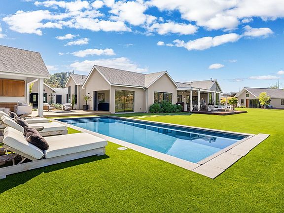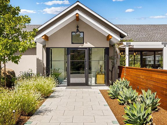 Experience privacy, luxury, & breathtaking vistas on this gated 3.27-acre estate, featuring 3 distinct buildings for a true compound feel. This single-level main residence showcases an open floor plan with vaulted ceilings. The expansive primary suite includes a grand designer's walk-in closet & a marble-appointed bathroom, while each guest bedroom offers its own ensuite bath & private exterior access. At the heart of the home, the gourmet kitchen is a chef's dream with Viking and Sub-Zero appliances, an oversized island, & seamless flow to the expansive covered deck and outdoor kitchen. Designed for entertaining, the grounds boast a sparkling in-ground pool & spa with a cabana featuring a fireplace, bar, outdoor shower, and full bathroom. Additional highlights include: Owned solar panels,Lutron lighting system, a detached 1,000 sqft gym/office/media suite and a newly added flexible space perfect for a wine cellar or custom use. Enhancing the property further, a beautifully designed 1,000 sq. ft. guest house with tall ceilings offers a full kitchen with Bertazzoni appliances, 1.5 baths, & a private bedroom ideal for guests, multi-generational living, or income potential. This exceptional property blends elegance, comfort, & every amenity for the ultimate wine country lifestyle.