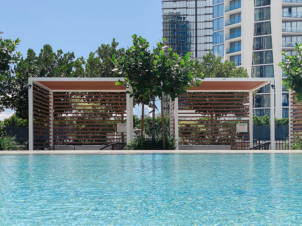 8th-floor resort-style pool deck with jacuzzi, cabanas, and BBQ areas